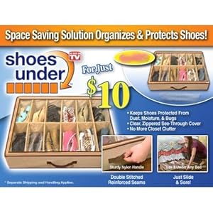 Product Description Shoes Under stores twelve pairs of shoes under your bed, saving you valuable closet space. Now you can keep your closets free of shoe clutter when you store your shoes in Shoes Under. The Shoes Under space saving shoe orgaizer keeps shoes protected from dust, moisture and bugs, holds up to 12 pairs of shoes, has a clear, zipper see-through cover and has a sturdy nylon handle.